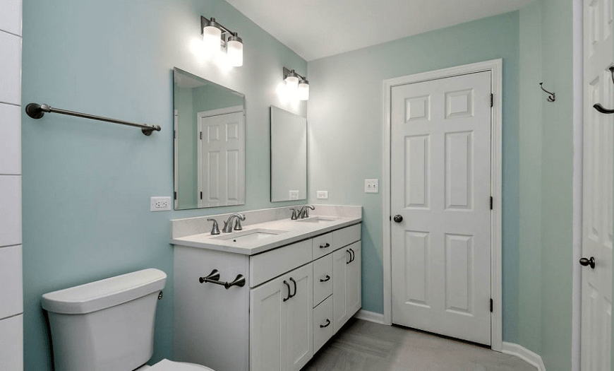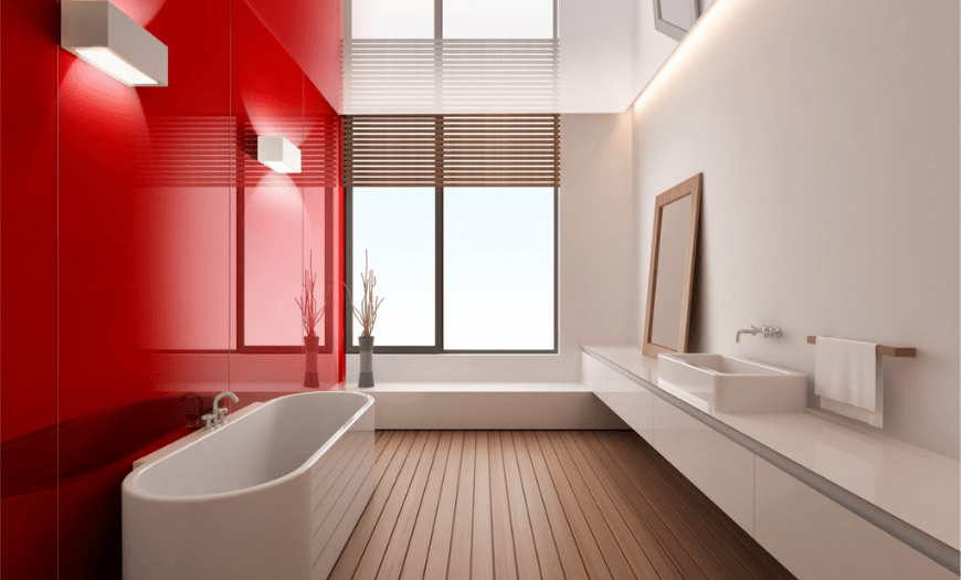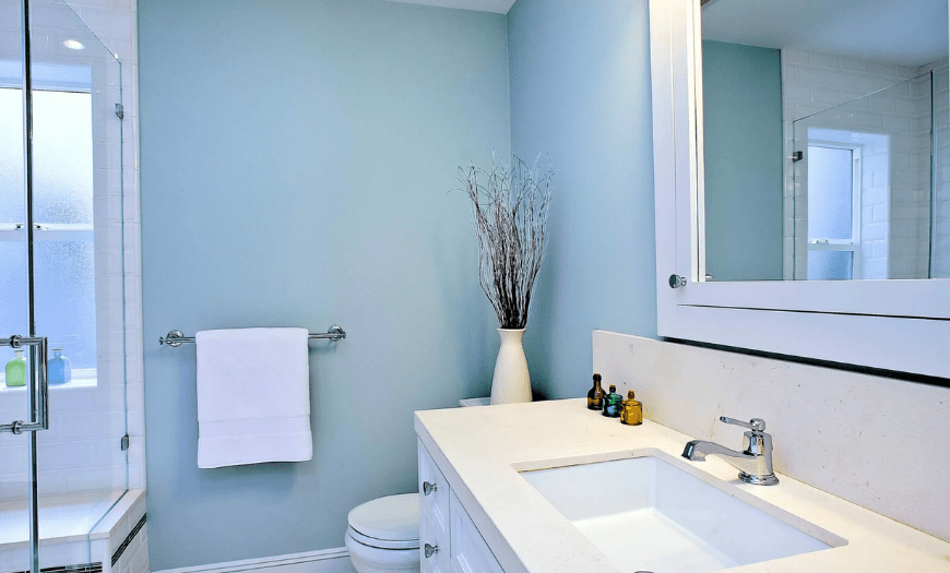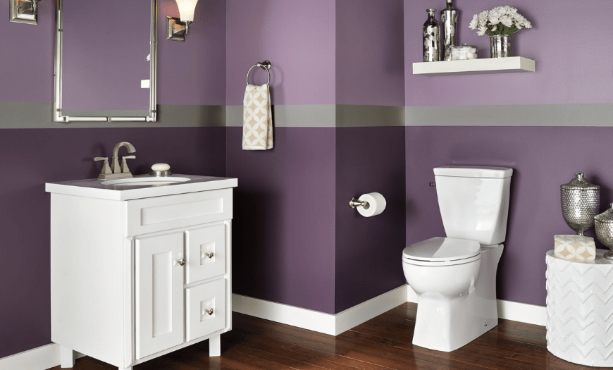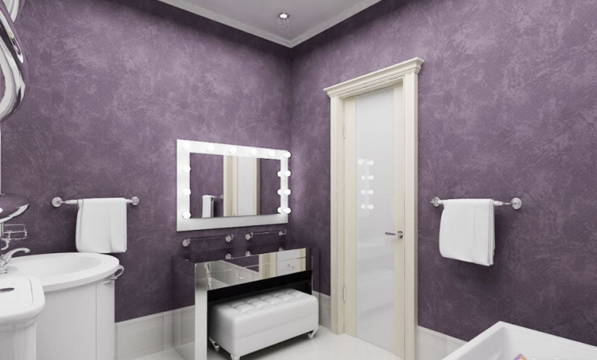 Наиболее распространенной отделочной технологией остается окрашивание. Для санитарной зоны подбирают водостойкую (силиконовую, алкидную) краску. Все чаще применяют латексный состав, который легко наносится разными способами. Он долговечный, быстро сохнет, не обладает резким запахом.