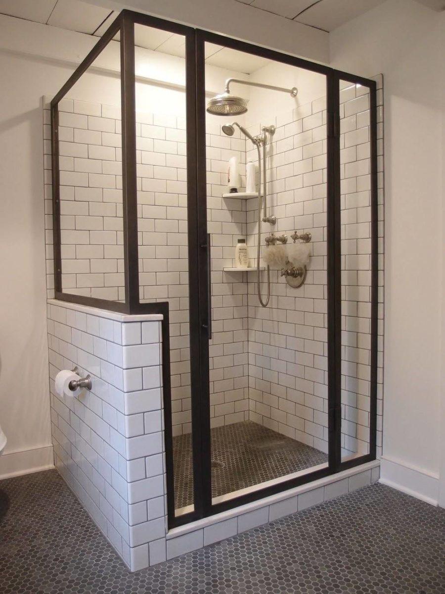 В небольших помещениях уместнее всего использовать одну перегородке, а дверь можно заменить на шторку, если есть необходимость. Это позволит избавиться от распашной двери, для которой так же требуется дополнительное место. Хорошей альтернативой является сдвижная дверь как у шкафа-купе. Такое решение удобно, если душевая широкая — от стенки до стенки. Для одноместных небольших душевых, современным и удобным решением будет использование стеклянной или пластиковой двери гармошки.