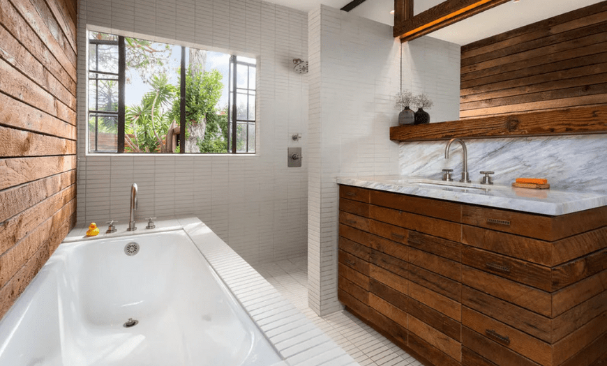 Натуральный материал привлекает экологической безопасностью. Для ванной дерево применялось редко. Это объясняется его способностью деформироваться и разрушаться при попадании капель. Можно использовать деревянные виды отделки, обладающие высокой плотностью. Это брус или рейки из древесины ироко, мербау, дуба, тика