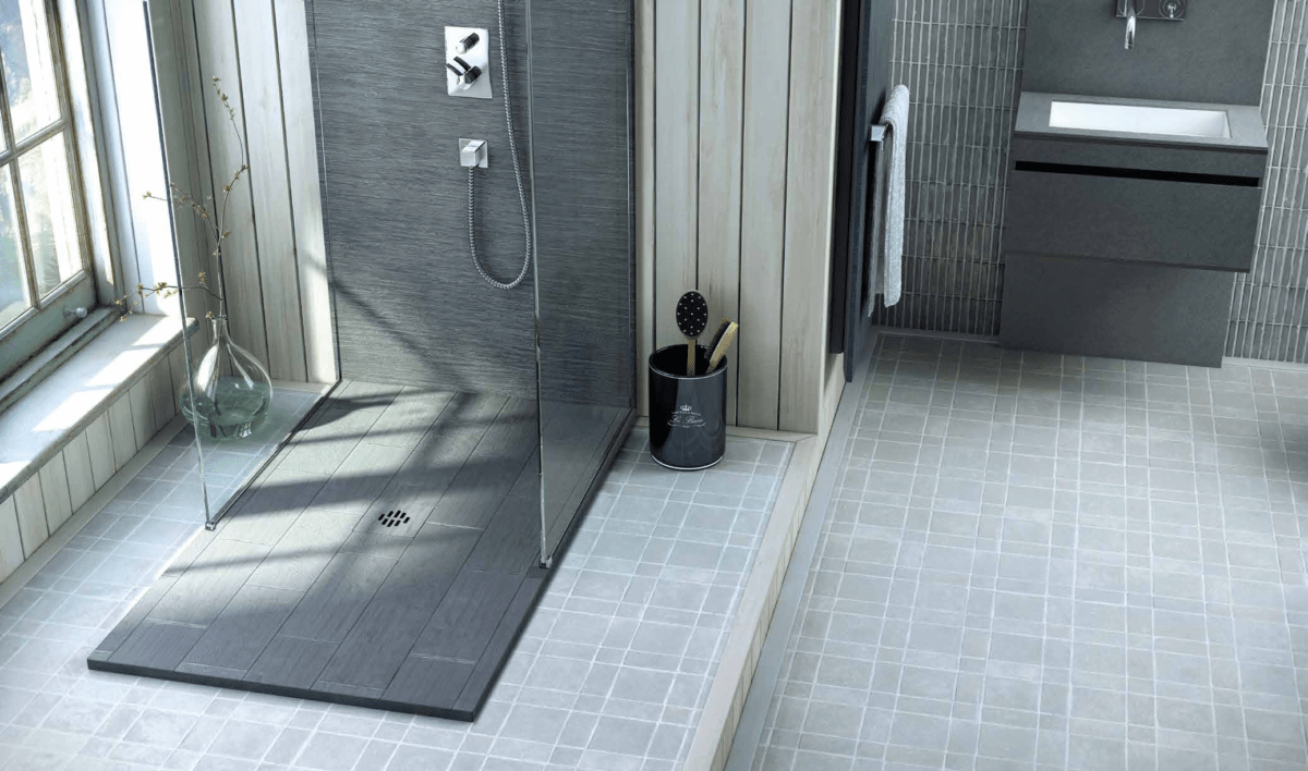 На полу нужен уклон к сливному трапу. Тут достаточно любого уклона, главное чтобы он был. Удобнее всего делать его мозаикой. Благодаря большому количеству швов она ещё и не скользкая.