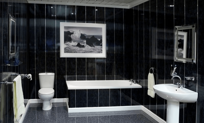 Получить аккуратный дизайн удобного совмещенного санузла позволит использование водостойкого пластика. Панели из этого материала представлены в разной цветовой гамме. Можно подобрать виды с изящными рисунками и геометрическими переплетениями.