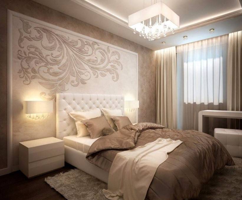 В таком помещении соединяется изысканная роскошь с монументальностью. По-королевски будет выглядеть спальня, оформленная в теплых светлых тонах. Допускается использование растительного орнамента, мягкой кожи или лепнины.