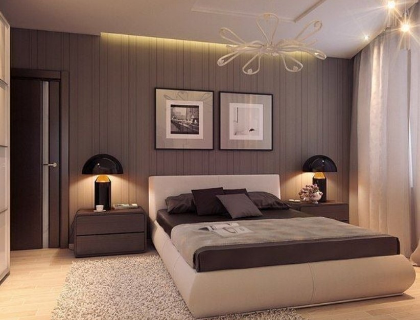 Идеальным вариантом в спальной комнате станет комбинация из пастельных тонов. Например, можно совместить темно-бежевые и молочные покрытия.