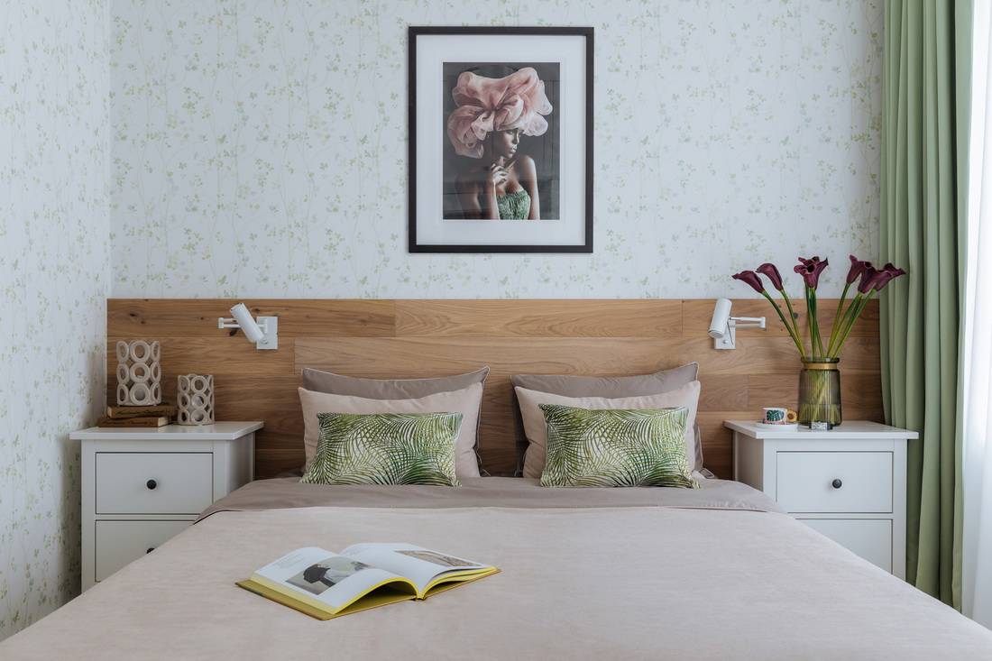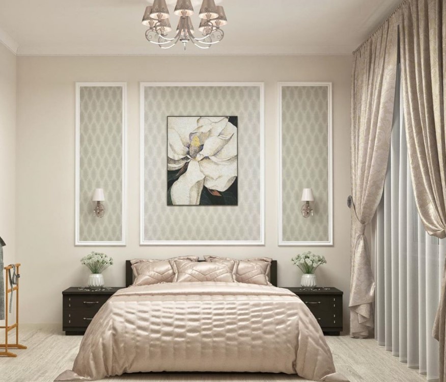 Эта спальня на втором фото одновременно проста и изысканна. Для создания акцента можно не отделывать всю стену узорчатыми полотнами. Порой достаточно создать несколько панно. Они отлично выделяются на однотонном фоне. Такой декор подчеркивает стену и является изюминкой спальни. Гармоничное сочетание цветов поднимает дизайн на новый уровень.