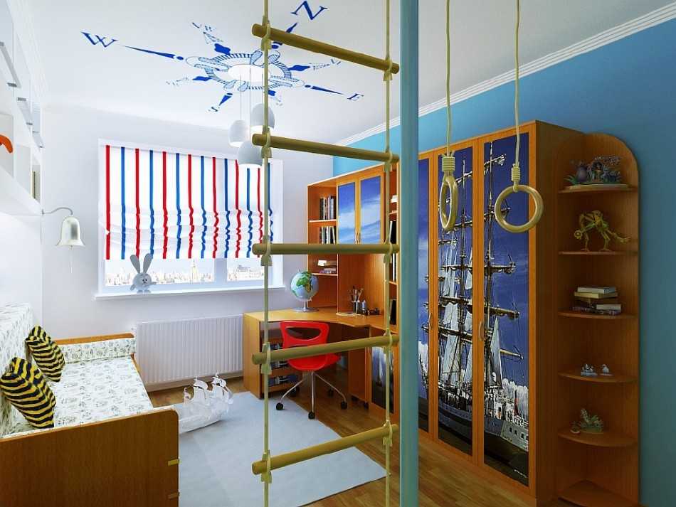 Отличается по оформлению детская для мальчика. Парни не любят такого изобилия мелочей, дополнительных красок, как это было при оформлении детской комнаты девочек. Следует обустроить комнату с помощью лишь самых необходимых предметов мебели.