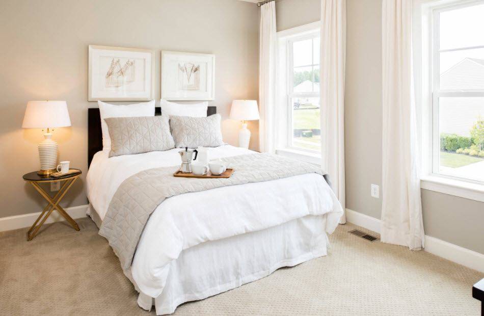 - Для создания стильного интерьера спальни достаточно базовых белого и серого цветов стен. Можно добавить 1 спокойный акцентный.