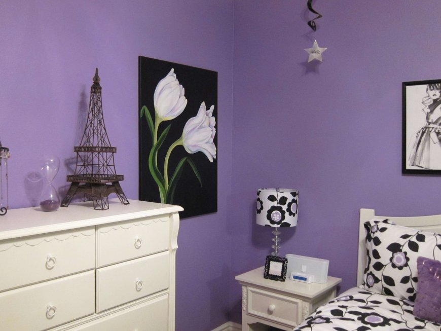 Например, одна сторона комнаты пусть будет лиловой, а противоположная — более светлой. Это поможет зрительно расширить пространство или сделать акцент на какой-либо части помещения.