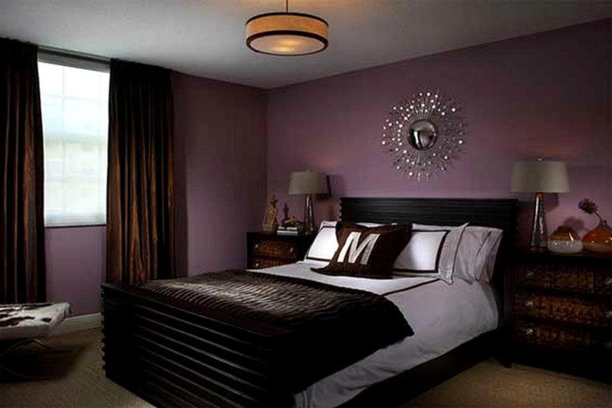 Также дизайн спальни в сиреневом цвете выглядит ярче, если к нему прибавить черный или коричневый в виде небольших штрихов. Например, такими элементами могут выступать определенные детали в интерьере вроде рам от картин, цветов мебели и т.д.