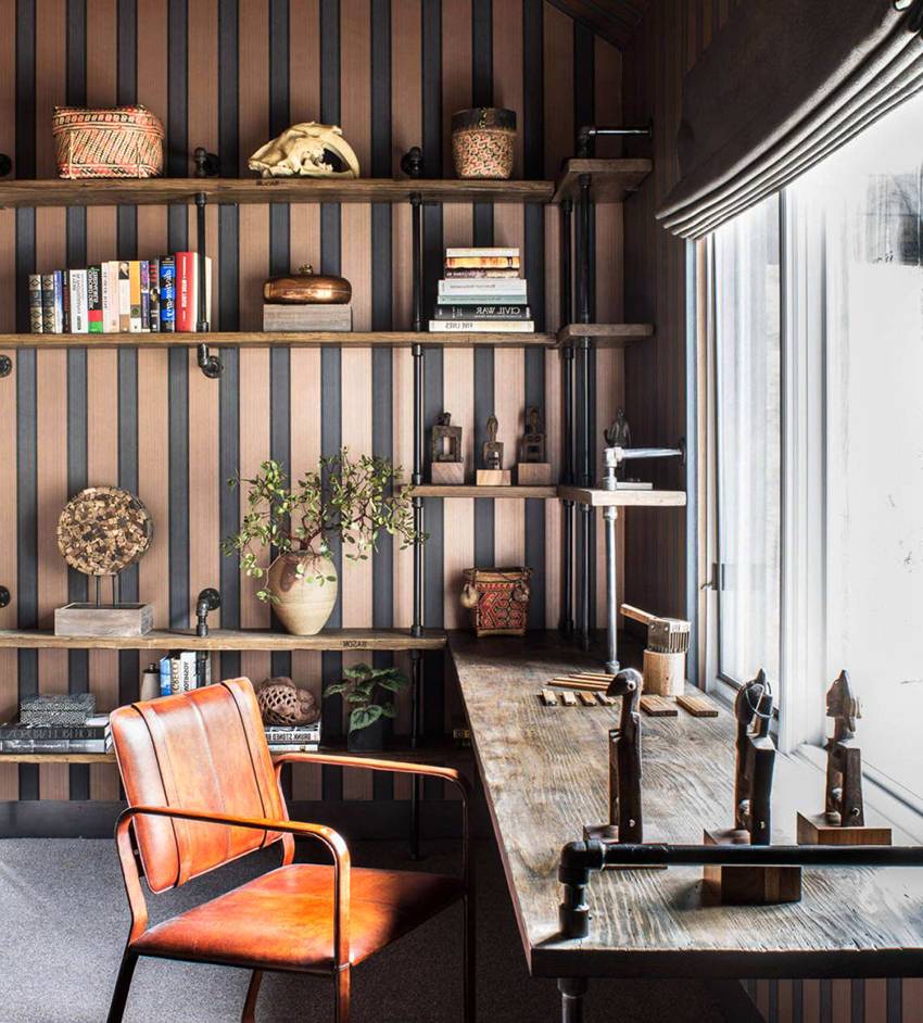 Британское направление часто встречается в кабинетах. Здесь вполне привлекательно смотрятся обои приглушенных тонов в клетку и полоску. В сочетании с мебелью из редких пород дерева и антиквариатом, настенное покрытие с этими рисунками делает пространство респектабельным.
