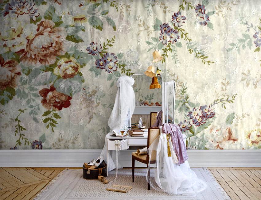 Дизайн обоев в цветочек предусматривает два варианта изделий: с небольшим деликатным, густо расположенным растительным орнаментом и с крупными цветами на полотне, однако в меньшем количестве. Органично будут выглядеть одиночные цветы, разбросанные по всей площади. Большой популярностью пользуются коллекции обоев с живописными розами и ветвистыми цветами, которые подойдут для спальни и гостиной.