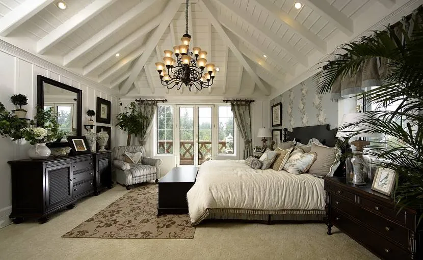 - Отделка потолка может быть довольно разнообразной. Все будет зависеть от размера помещения, вкуса владельца и личных предпочтений. Поверхность можно просто выкрасить белой краской и дополнить широким ступенчатым карнизом. Центр потолка можно украсить рельефной розеткой строгого орнамента. Такой потолок хорошо будет выглядеть в небольшой комнате или лаконично обставленной спальне. Многоуровневые конструкции с дополнительной подсветкой, лепные украшения и ручная роспись хорошо выглядят в просторных спальнях, тяготеющих к викторианскому стилю. Потолочные балки из дерева или его хорошей имитации отлично подойдут для спальни, где высота потолков превышает 2,8 метра.