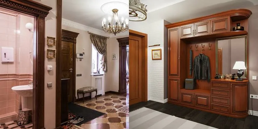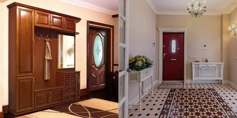 Приглушенные цвета стен, геометрия, витиеватый рисунок делают прихожую эффектной! Однако помещение может быть и в светлых тонах. Тогда на помощь придут однотонные обои в английском стиле, с приятной пастельной гаммой.