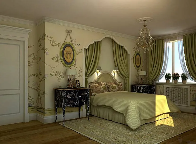 Отличительной особенностью таких спален являются большие кровати с тканевыми балдахинами на массивных, украшенных резьбой ножках. Проемы окон — высокие, но не широкие.