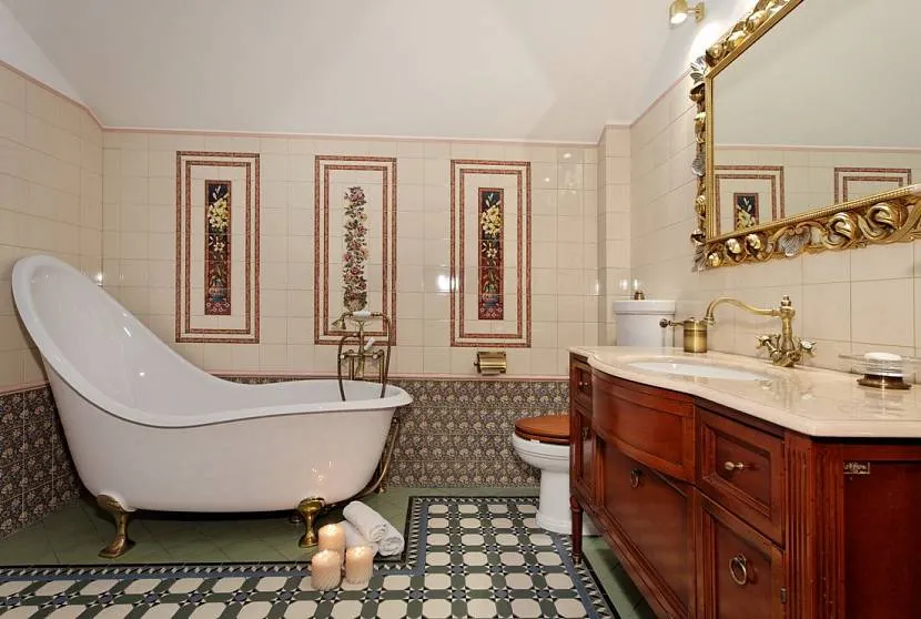 Для отделки пола в исторических интерьерах принято было использовать каменную плитку, шлифованную доску или художественный паркет. Сегодня можно применять современные материалы, которые имитируют натуральную фактуру. На пол желательно уложить паркет или ламинат, что будет приемлемо для гостиной. Для кухни и ванной комнаты подойдет керамическая плитка, которая может быть выложена узорно, состоять из фрагментов разного размера, цвета и фактуры. Напольная поверхность должна выполняться в темной палитре с использованием коричневого, терракотового или красного цвета.