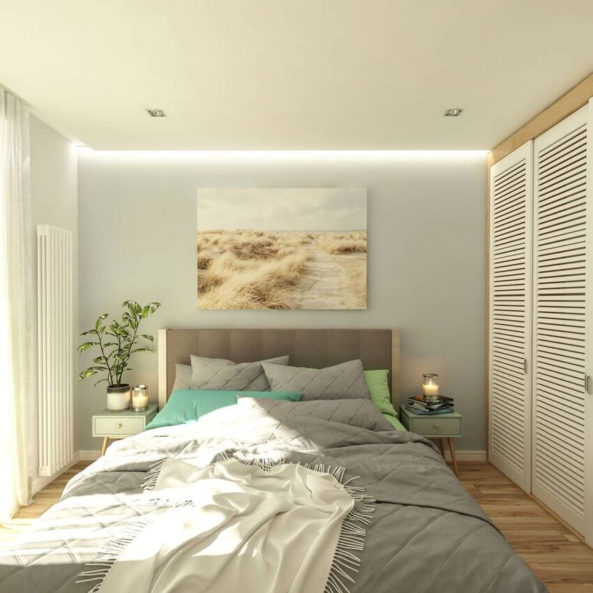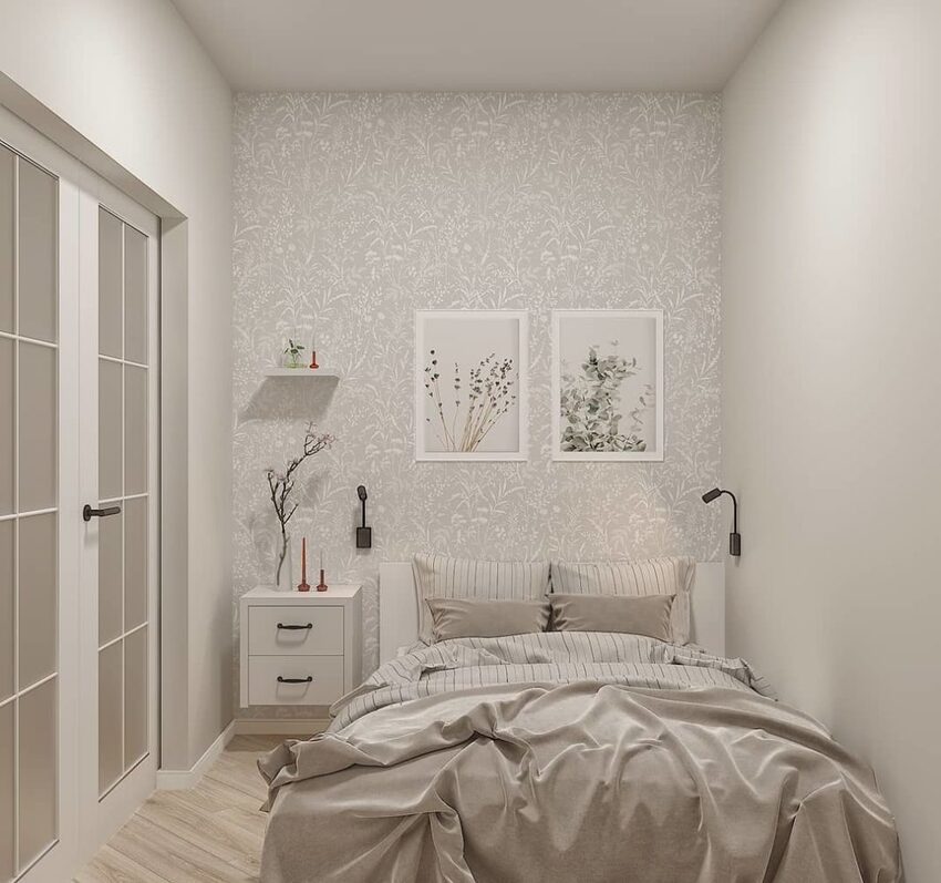 Вы задаетесь вопросом, как отделать стены, чтобы маленькая спальня выглядела немного больше? Делайте ставки на яркие цвета, но не бойтесь сочетать два цвета. Умело подобранные оттенки не будут перегружать небольшое пространство.