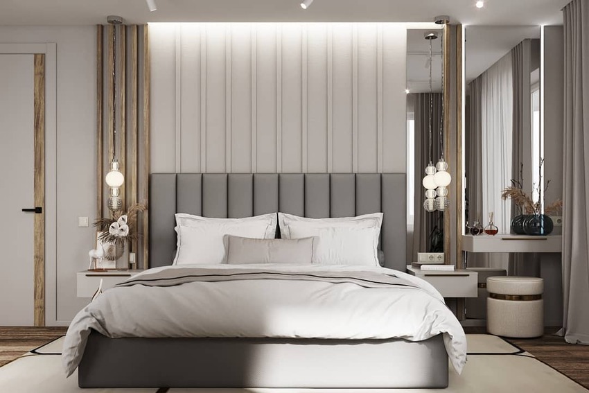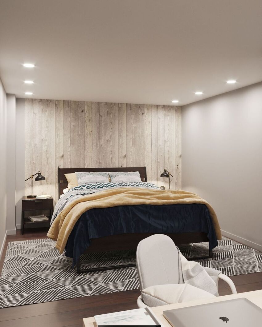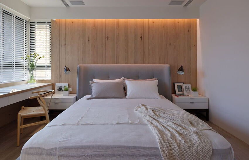 Отличным решением будет создание акцентной стены из ламината. Этот актуальный и модный тренд прекрасно впишется в интерьер спальни.