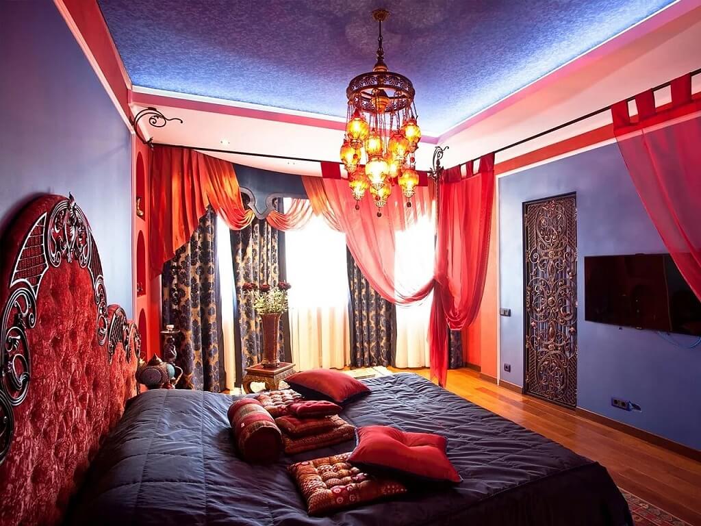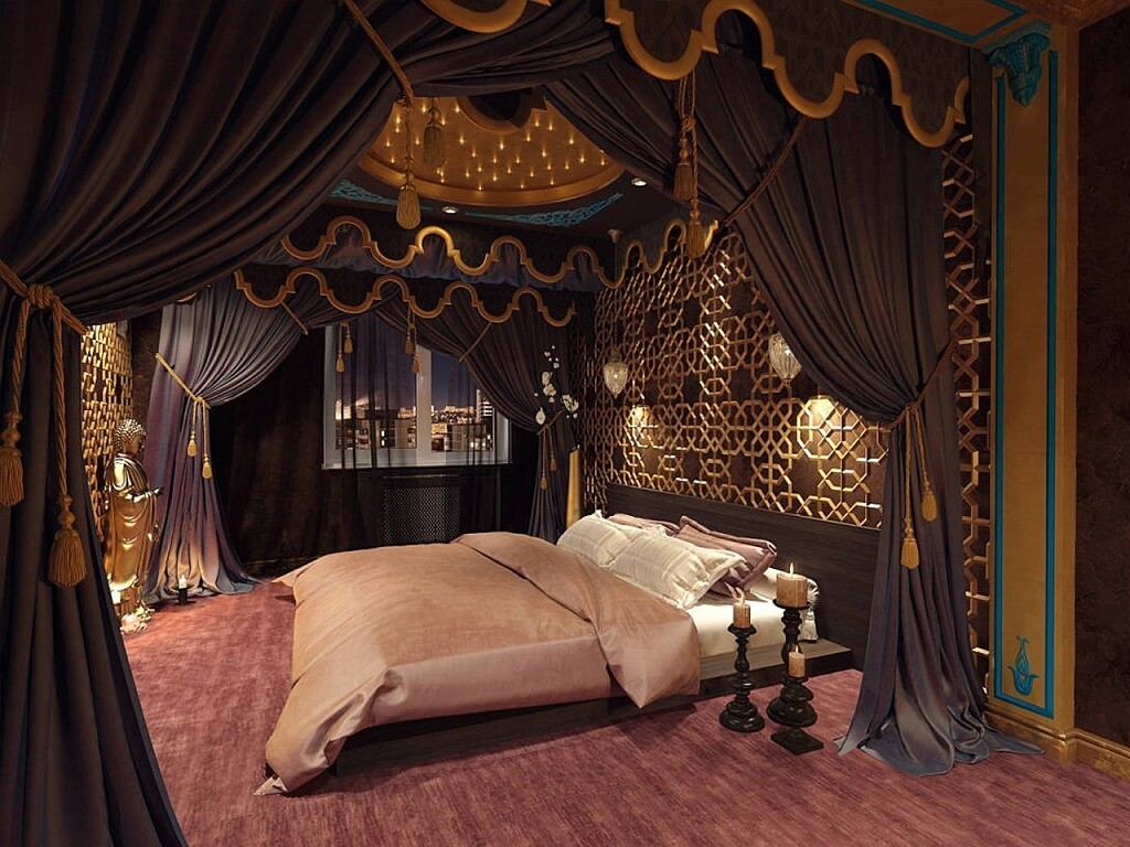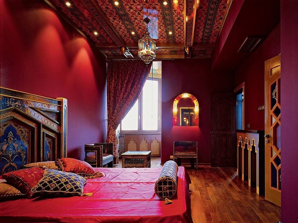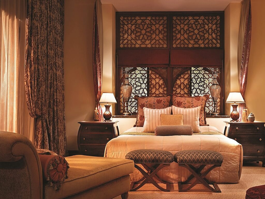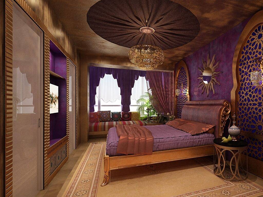 Но чаще всего, если говорить именно про «восточный» стиль в дизайне, подразумевают такие страны, как Марокко, Тунис, Объединенные Арабские Эмираты и иные арабские государства. Спальня, обустроенная в арабском стиле, может перенести каждого человека в популярную сказку «1000 и 1 ночь». Лишь эксцентричный и обожающий эксперименты человек решиться на оформление свой спальной комнаты, подражая марокканским дворцам, которые утопают в роскоши.