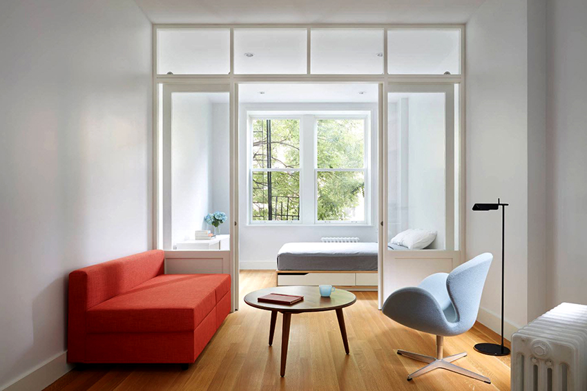 Если в комнате есть ниша достаточного размера, спальню можно разместить прямо в ней. Чаще всего ширины ниши хватает для размещения полноценной кровати. В качестве перегородки хороши стеклянные раздвижные двери, они не только спрячут от посторонних спальню, но и позволят проникать внутрь достаточному количеству естественного света.