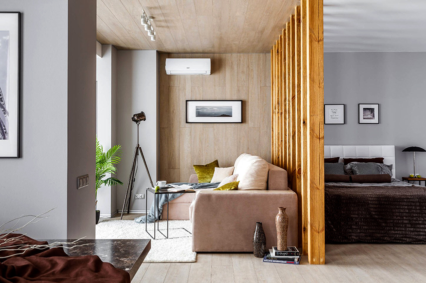 Пришедший с севера интерьер принесет с собой светлые цветовые решения. В отделке много дерева, поэтому зонирование можно будет выполнить с
