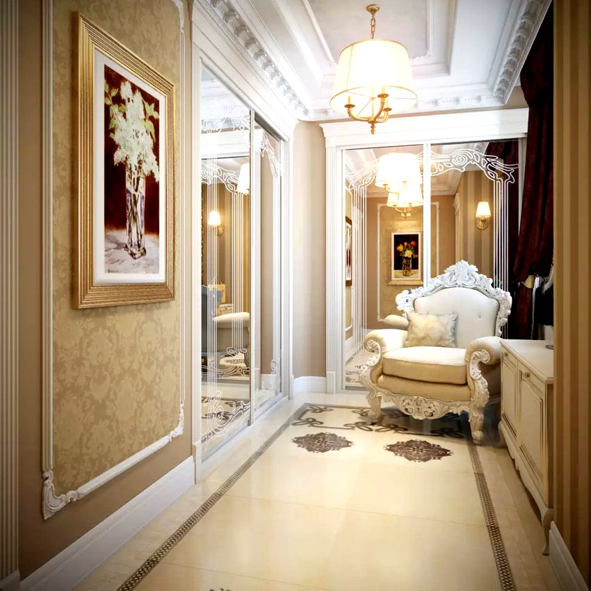 И снова на помощь приходит зонирование – на этот раз из прихожей делаем входную зону и место отдыха. В районе двери вдоль стены очень органично уместится мебель с зеркальным фасадом и подсветкой. А вот в зоне отдыха вполне можно поставить небольшую кушетку или пару кресел и телевизор. Освещение можно сделать приглушенным – здесь будут уместны торшеры, декоративные бра и даже напольные фонари. Сделайте акцент на украшение интерьера – живые цветы в больших кадках, красивые часы, вазы и картины будут очень хорошо смотреться, главное, чтобы они были выдержаны в едином стиле. Границы прихожей можно обозначить фактурными материалами, полом разного уровня и даже арочными проемами.