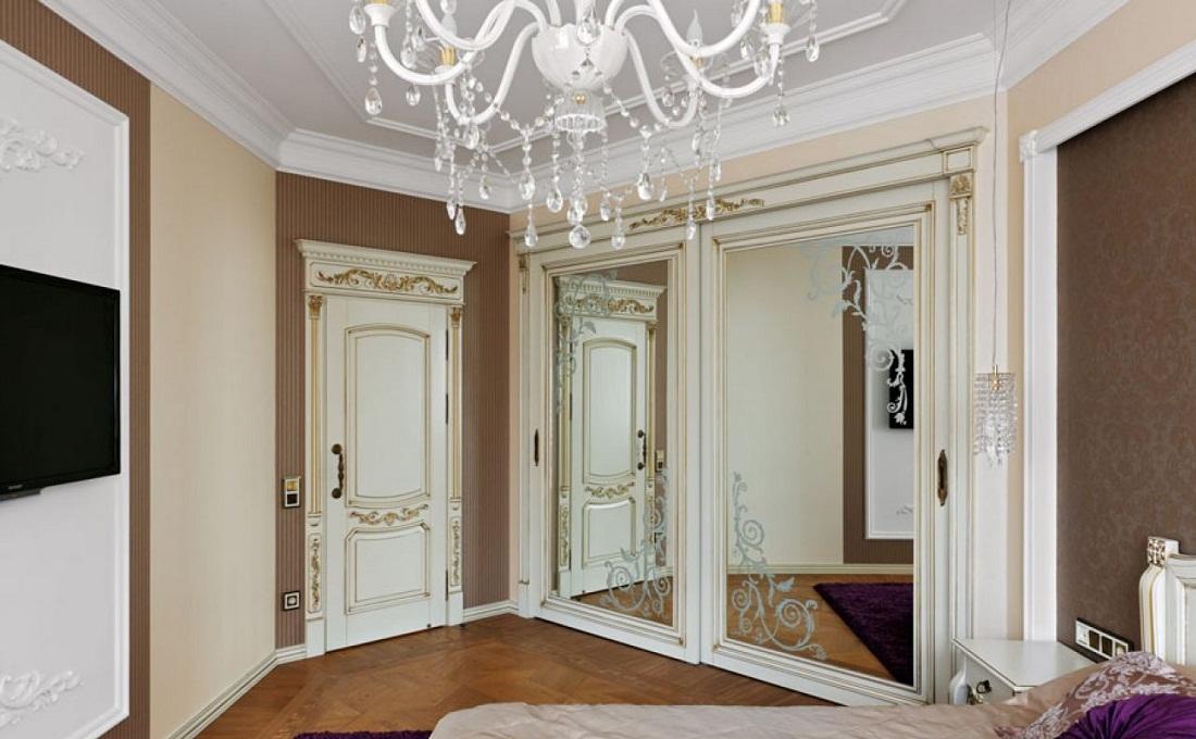 В спальне отводится место для гардероба, в ванной зеркало – обязательный атрибут, в прихожей с помощью зеркала можно оценить свой внешний вид перед выходом из дома. Практичность расположения такой двери в указанных помещениях заключается в возможности визуально сделать их просторнее.