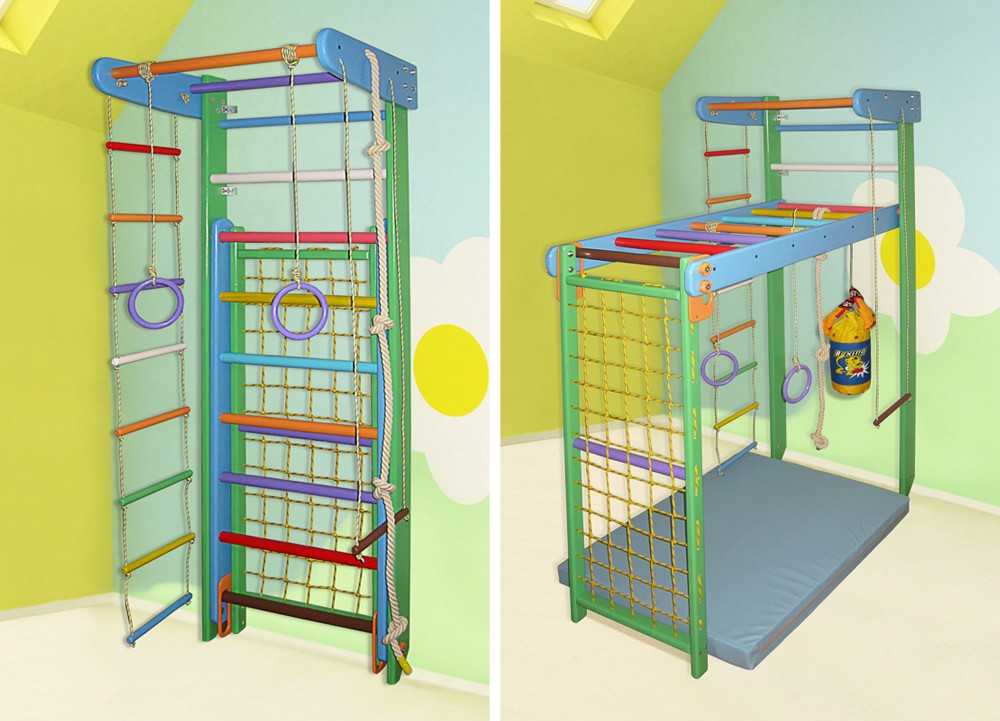 Есть два вариант детских спортивных уголков — отдельно стоящие (с платформой или без) и те, которые крепятся к стене. Обычно отдельно стоящие — это спортивные комплексы для малышей — они имеют небольшую высоту, полого расположенные стенки, лесенки. Так маленьким детям проще осваивать спортивные снаряды.