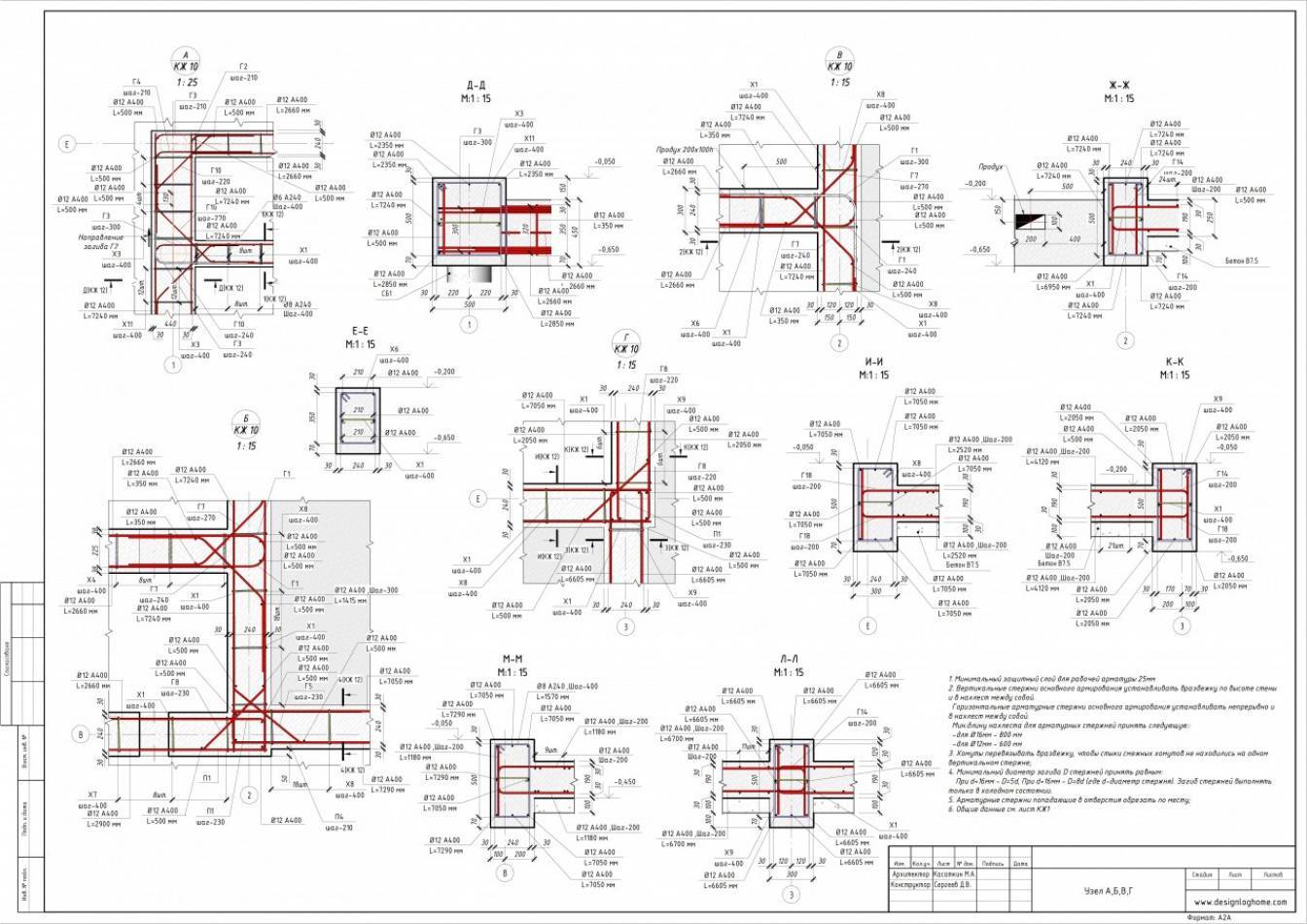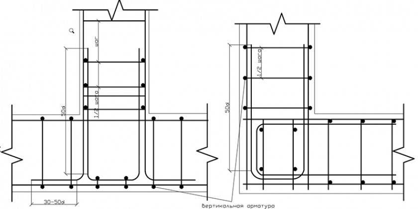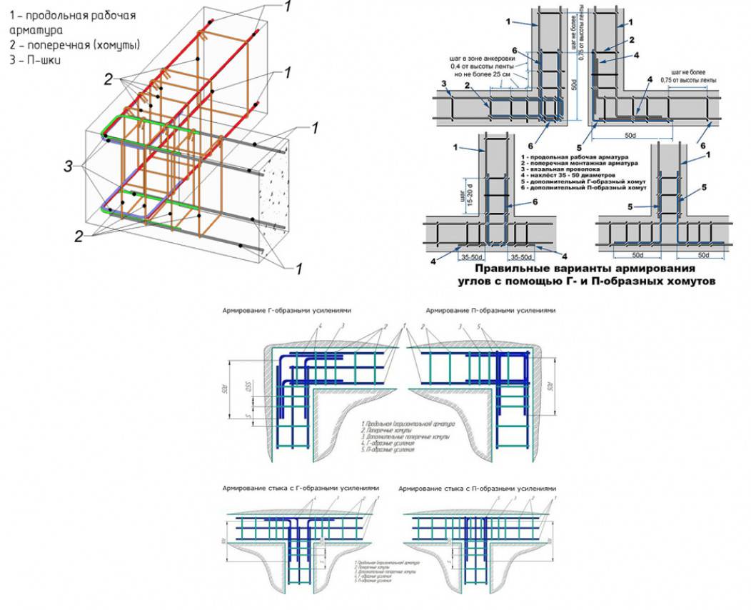 Особого внимания требуют углы, на участках перераспределения напряжения каркас усиливается загнутыми прутьями. Рекомендуемые схемы включают анкеровку Г-образными или П-образными элементами, или загиб продольного ряда. Поддерживающая арматура укладывается в верхнем поясе, минимальная длина одной стороны – 50 см. Также на этих участках сокращается интервал размещения продольных прутов, шаг для фундаментов стандартного сечения – 25 см. Выполнение этих условий актуально даже при строительстве легких построек типа бани, обычной связки проволокой в углах недостаточно.