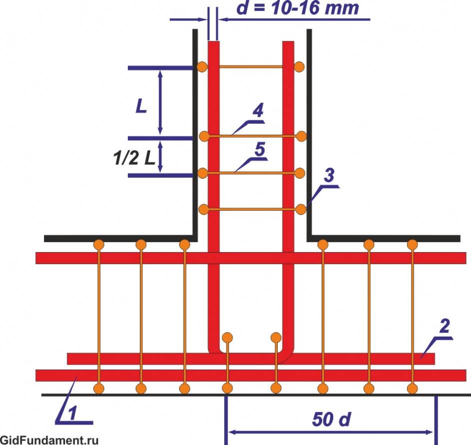 Общее количество соединений вычисляется так: величину длинной стороны фундамента нужно разделить на количество поперечных прутьев и количество вертикальных рядов продольных стержней арматуры