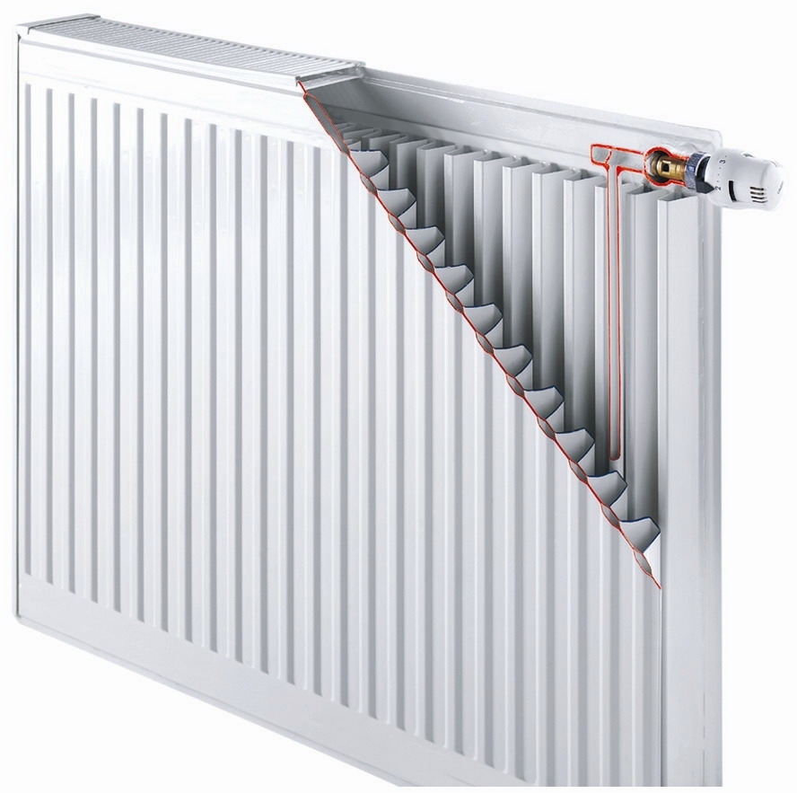 Как выглядит конструкция устройства стальной батареи отопления? Стальной радиатор для обогрева, представленный прямоугольной панелью, сделанной из двух стальных пластин. Листовые пластины сварены лазерной сваркой, внутри есть каналы для жидкости.