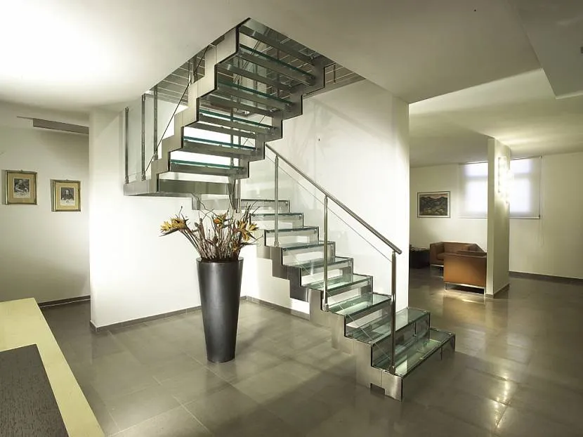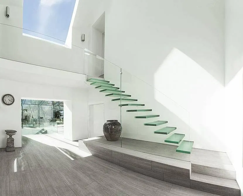 - косоурные, универсальный тип лестниц, конструктивные особенности которых подразумевают установку стеклянных ступеней сверху несущей балки. Возможна практически любая геометрия лестниц;
