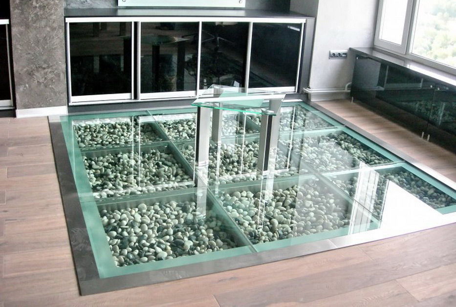 - большой стеклянный пол по всему размеру комнаты. Это довольно смелое и дорогое дизайнерское решение. Внутри пол заполняют любыми декоративными элементами, гармонирующими с общим дизайном интерьера;
