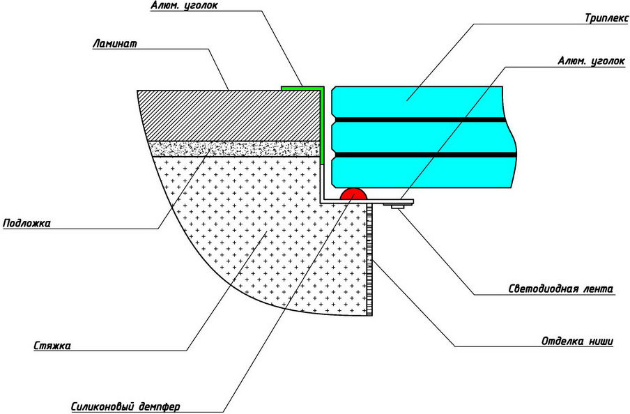 Конструкция пола представляет собой стеклянную нишу, которая имеет различные формы и размеры. Внутри ее могут находиться декоративные элементы (галька, песок, растения, кораллы и т.п.). Конструкционными элементами таких полов являются: стеклянные панели и подсветка. Силовая конструкция из стали служит опорой для стеклянных плит. По периметру ниши монтируется металлический каркас с помощью Его необходимо надежно закрепить, так как от этого зависит качество и срок эксплуатации напольного покрытия. Чтобы обеспечить плотное прилегание панелей из стекла, между рамой и профилями укладывается уплотнительная резиновая или силиконовая лента.