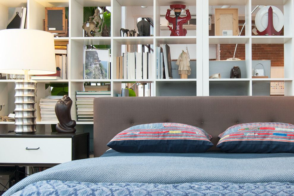 На фото спальная зона, отделенная с помощью трехъярусного ступенчатого стеллажа-перегородки.