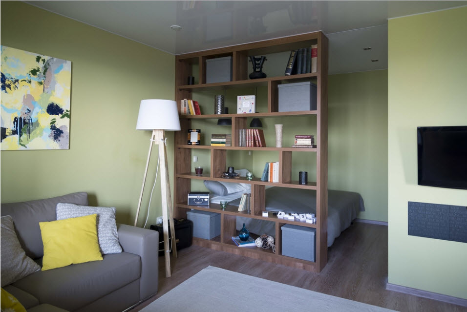 Достаточно часто приобретается для зонирования помещений. Особенно популярно такое решение у владельцев квартир-студий, где вытянутая комната сама требует установки какой-либо перегородки. Здесь и пригодится стеллаж, который можно заполнить декоративными безделушками, книгами или бытовой техникой с различными электронными аксессуарами.