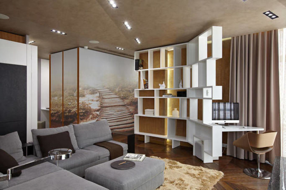 А небольшая конструкция, играющая роль перегородки без стенок, будет как — бы частью планировки гостиной.