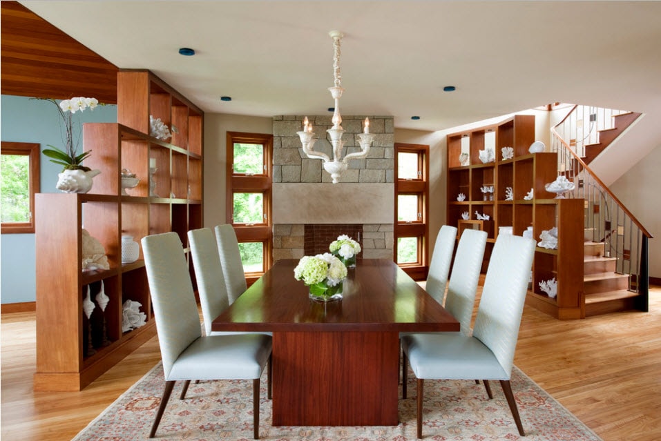 Обеденная зона на территории гостиной комнаты отлично «впишет» стеллаж для красивой посуды, сервиза и похожих аксессуаров.