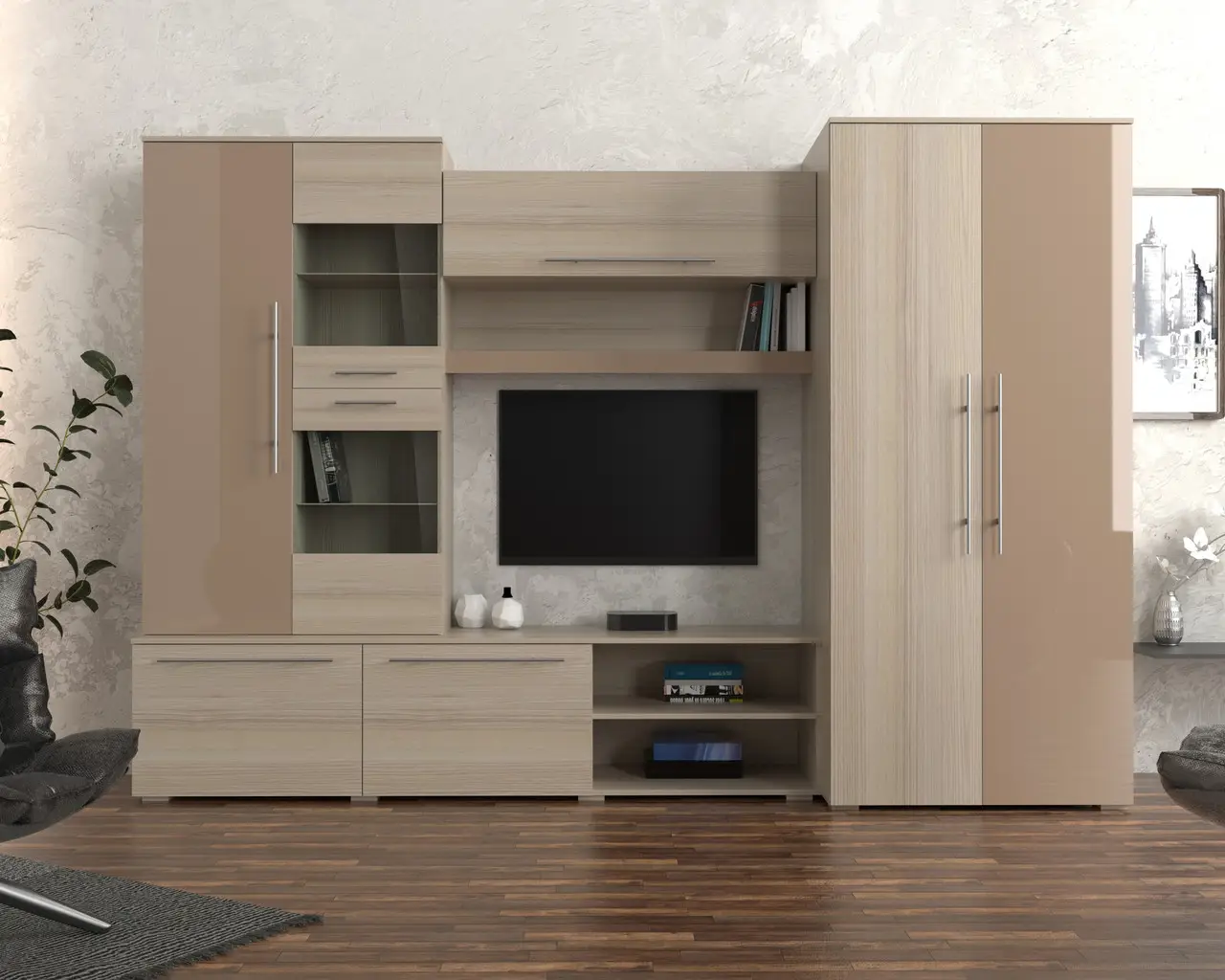 Мебельная стенка в гостиной со шкафом для одежды может включать самые разные элементы, иметь разную конфигурацию и самую разную конструкцию.