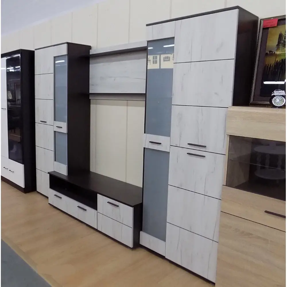 Вторым по популярности материалом для изготовления мебельных стенок является ламинированная древесно-стружечная плита (ЛДСП). Из неё в основном делают корпуса и фасады гостиных гарнитуров. Благодаря дешевизне материала стенки из него отличаются доступной ценой. Широкая цветовая палитра и разнообразие текстур позволяет изготавливать мебель, подходящую практически под любой стиль интерьера.