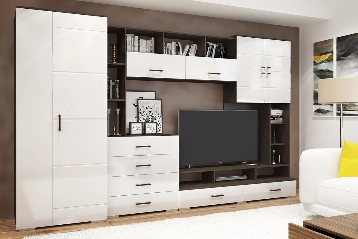 Стенка со шкафом на всю длину торцевой стены гостиной