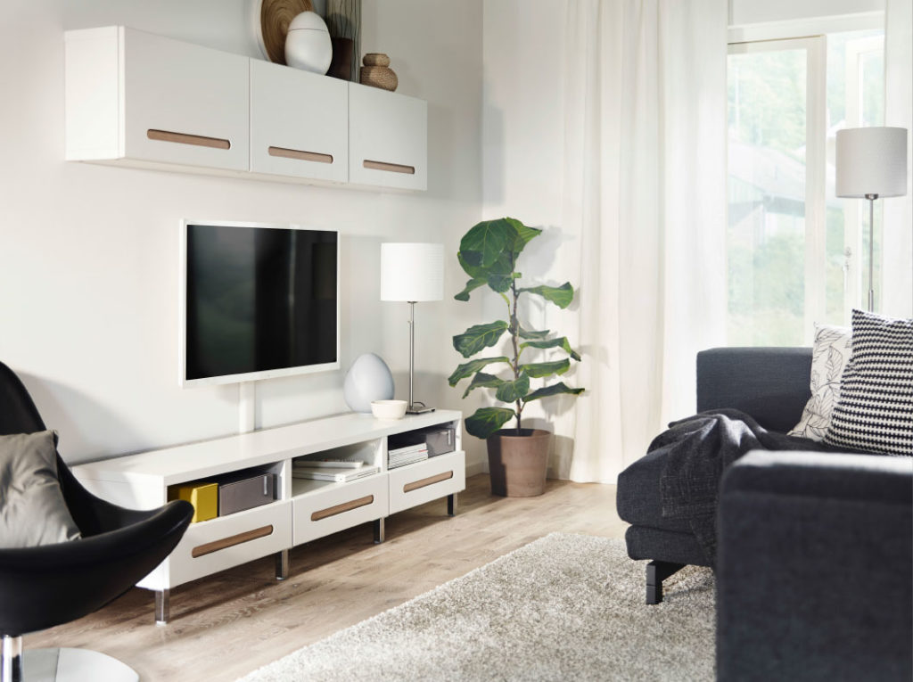 Такие модели также подойдут для небольших гостиных. Они состоят из небольшого количества модулей и имеют компактные размеры. Обычно в состав такого гарнитура входит небольшой стеллаж, полки и тумба под телевизор.