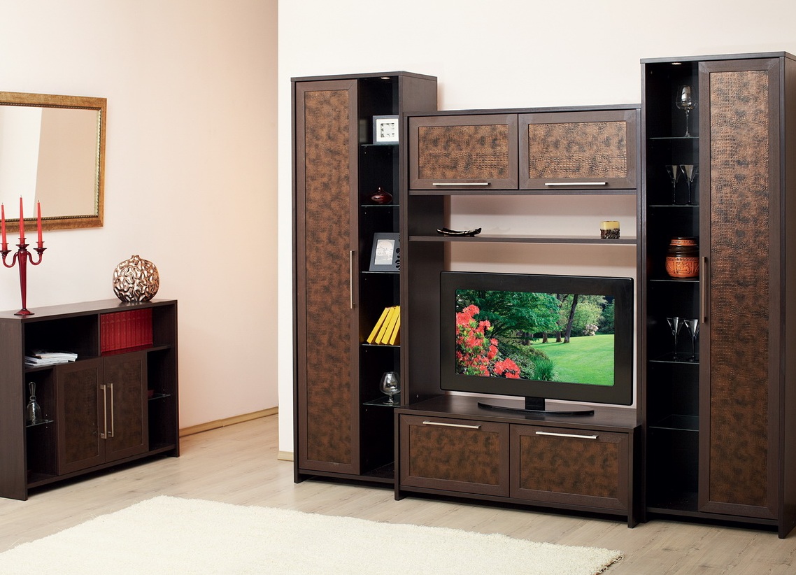 Большинство стенок для гостиной имеют стандартный набор модулей: