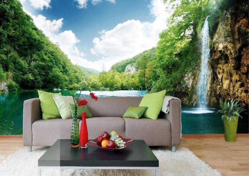 Наибольшее количество вариантов можно использовать при декорировании гостиной. Здесь можно выбрать и сюжетные изображения, природные пейзажи и графику, абстракцию. Как правило, гостиная − просторная комната. Это можно использовать для воплощения самых смелых идей. Есть возможность сделать акцент на одной стене или задействовать все. Размеры комнаты позволят насладиться 3Д эффектом в полной мере