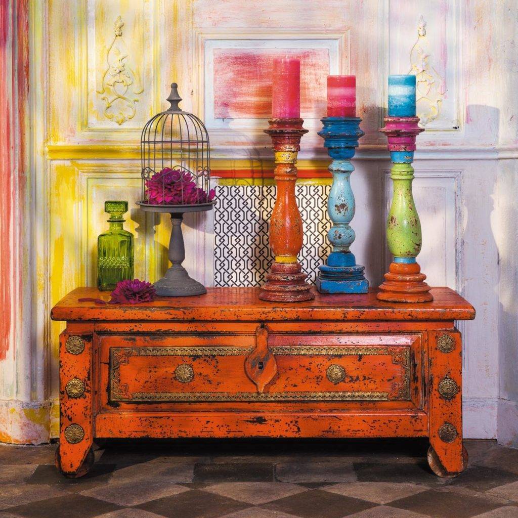 - Мебель. Простые и удобные формы, комфорт, яркая обивка, вязаное покрывало, множество разноцветных подушек — таким должен быть диван в стиле бохо. Что касается корпусной мебели, то можно остановить свой выбор на винтажной горке, буфетах, сундуках, необычной формы столиках. Есть масса оригинальных идей и художественных техник, при помощи которых мы можем своими руками создавать истинные шедевры бохо.