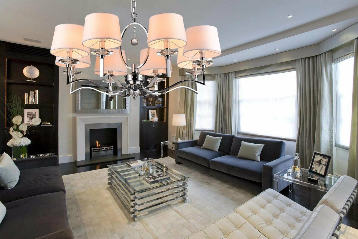 Современная стильная гостиная должна быть наполнена светом, которого много быть не может. Для этого применяются различные осветительные приборы, начиная от традиционных потолочных люстр и настенных бра и заканчивая ультрасовременными точечными светодиодными лампами.