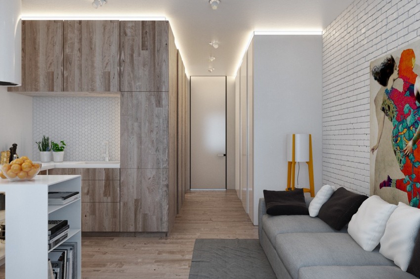 Потолок следует оформлять на тон светлее стен. Это добавит дополнительной высоты небольшому помещению. Максимум свободы привнесет использование точечных светильников, маленьких люстр, настенных бра, небольших плафонов, параллельно свисающих с потолка. На примере интерьера маленькой квартиры (фото это подтверждают) использовано комбинированное освещение с помощью ярких точечных светильников и настенных бра.