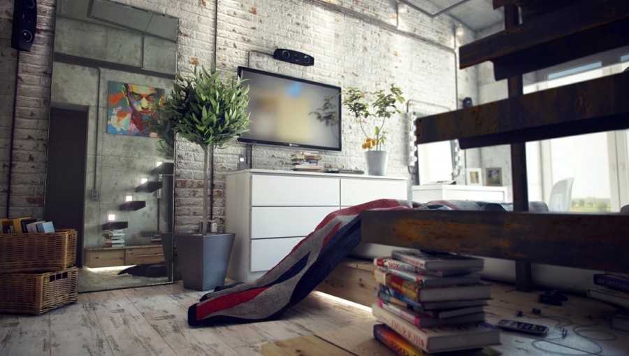 Жилые комнаты в этом стиле преимущественно можно встретить с открытыми кирпичными стенами.
