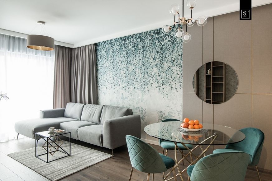 Среди трендов в современной отделке стен фигурируют геометрические принты, 3D-обои, растительные мотивы, напоминающие листы из гербария, мягкие градиенты, а также многочисленные спокойные, ненавязчивые расцветки. Если вы собираетесь поменять в зале не всю обстановку, отталкивайтесь от той отделки и мебели, которую вы менять не будете. Обои с вензелями в интерьере гостиной смотрятся неуместно вместе с советской мебелью и большими стенками в стиле 80-х, 90-х и нулевых.