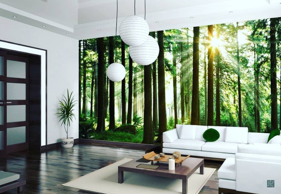 Если гостиная просторна, то выбор ограничивается лишь фантазией, с единственным ограничением – не стоит выбирать фотообои со сплошным узором из мелких деталей, он может потерять свою привлекательность, а издалека картинка может казаться размытой.
