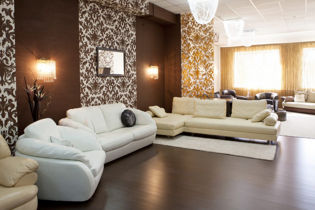 Дизайн большого зала, наоборот, предполагает для комнаты применять обои с крупным рельефным рисунком. Лучше, если при этом будут сочетаться различные оттенки. Для большой комнаты выбирайте глубокие цвета, на фоне которых вытеснены узоры или отдельные рисунки. Такие идеи сделают помещение более уютным.