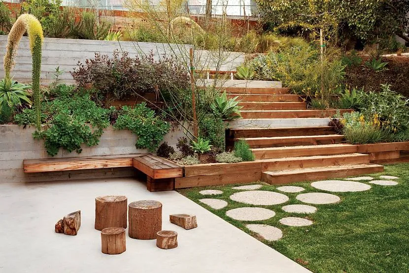- дорожки из пеньков. Такую сказочную дорожку можно создать собственными руками, а выглядит она в ландшафте невероятно красиво и в духе скандинавского стиля.